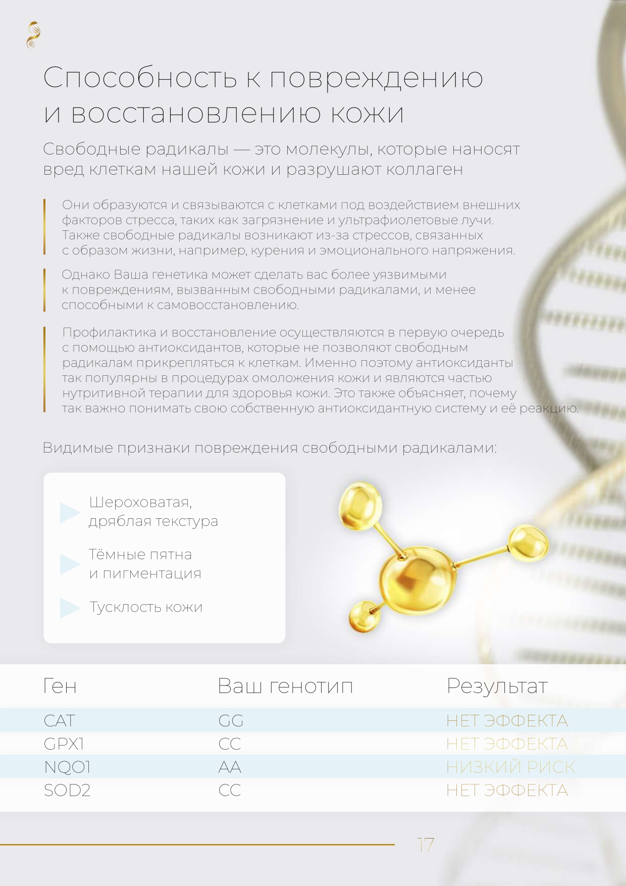 Мы анализируем более 100 генов, чтобы создать персональный генетический паспорт красоты и помочь вам подобрать идеальный уход на основе вашей ДНК. Анализ семи ключевых аспектов здоровья кожи показывает: